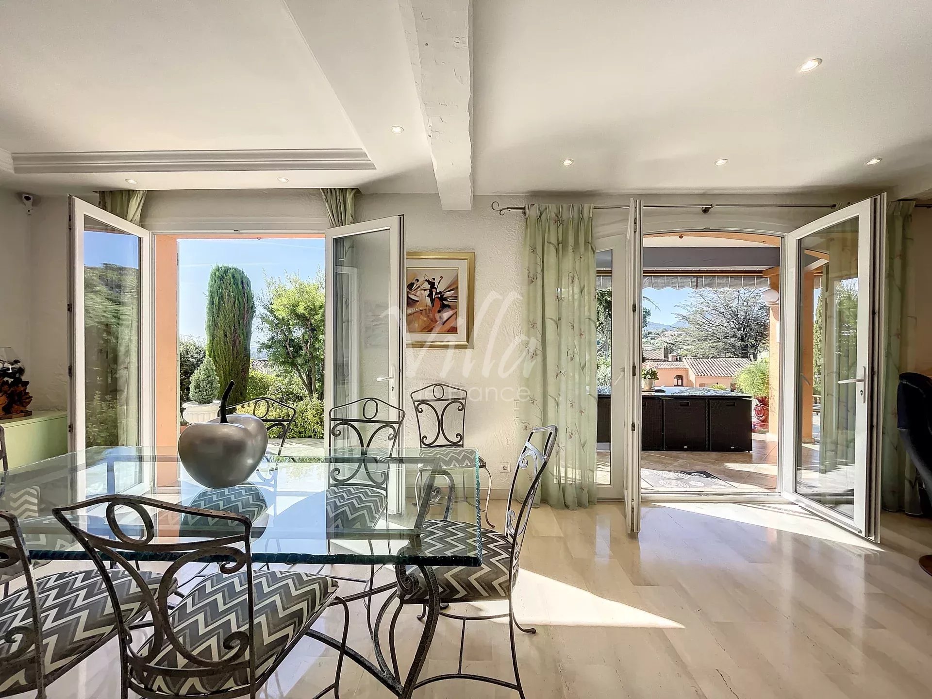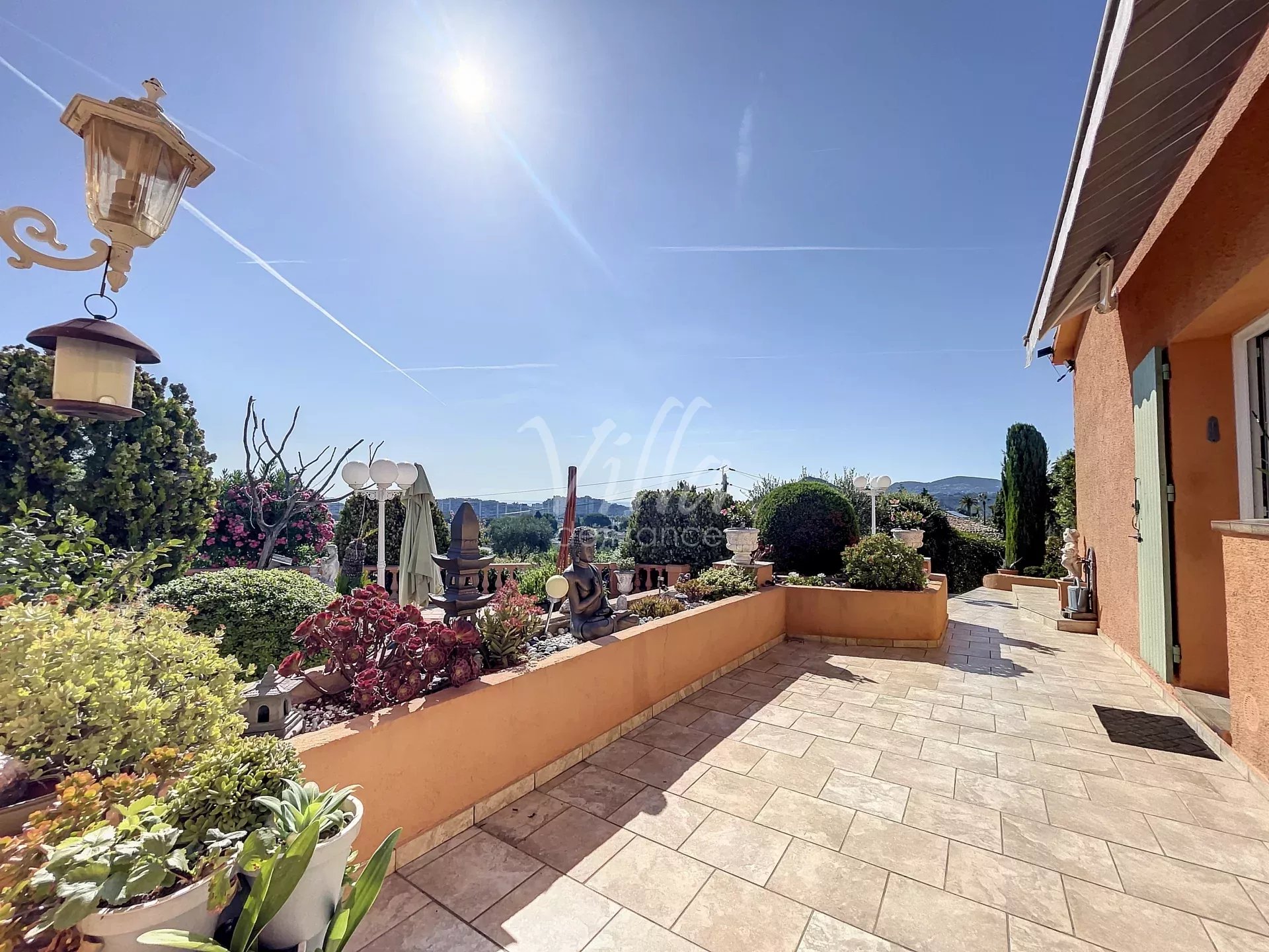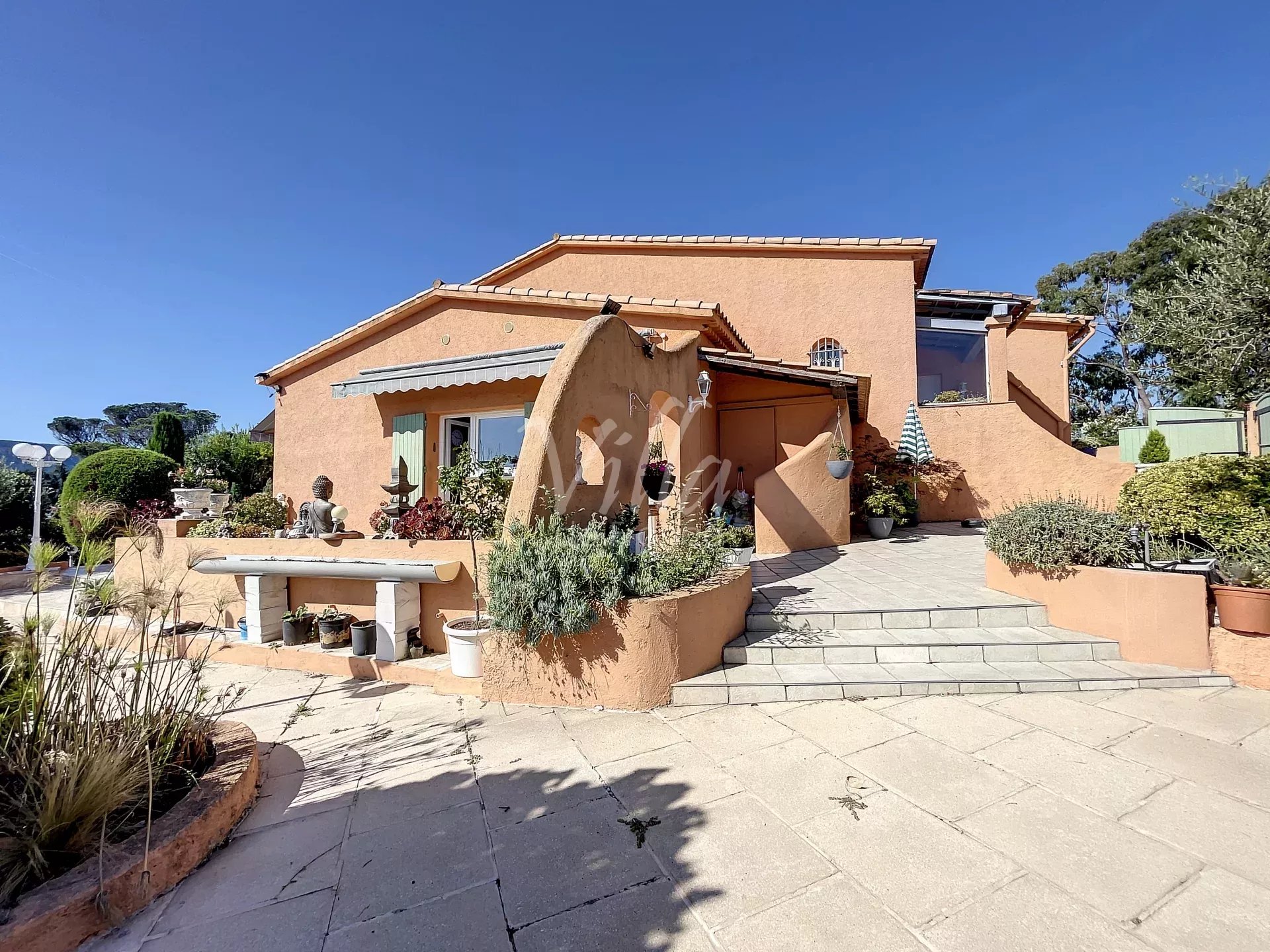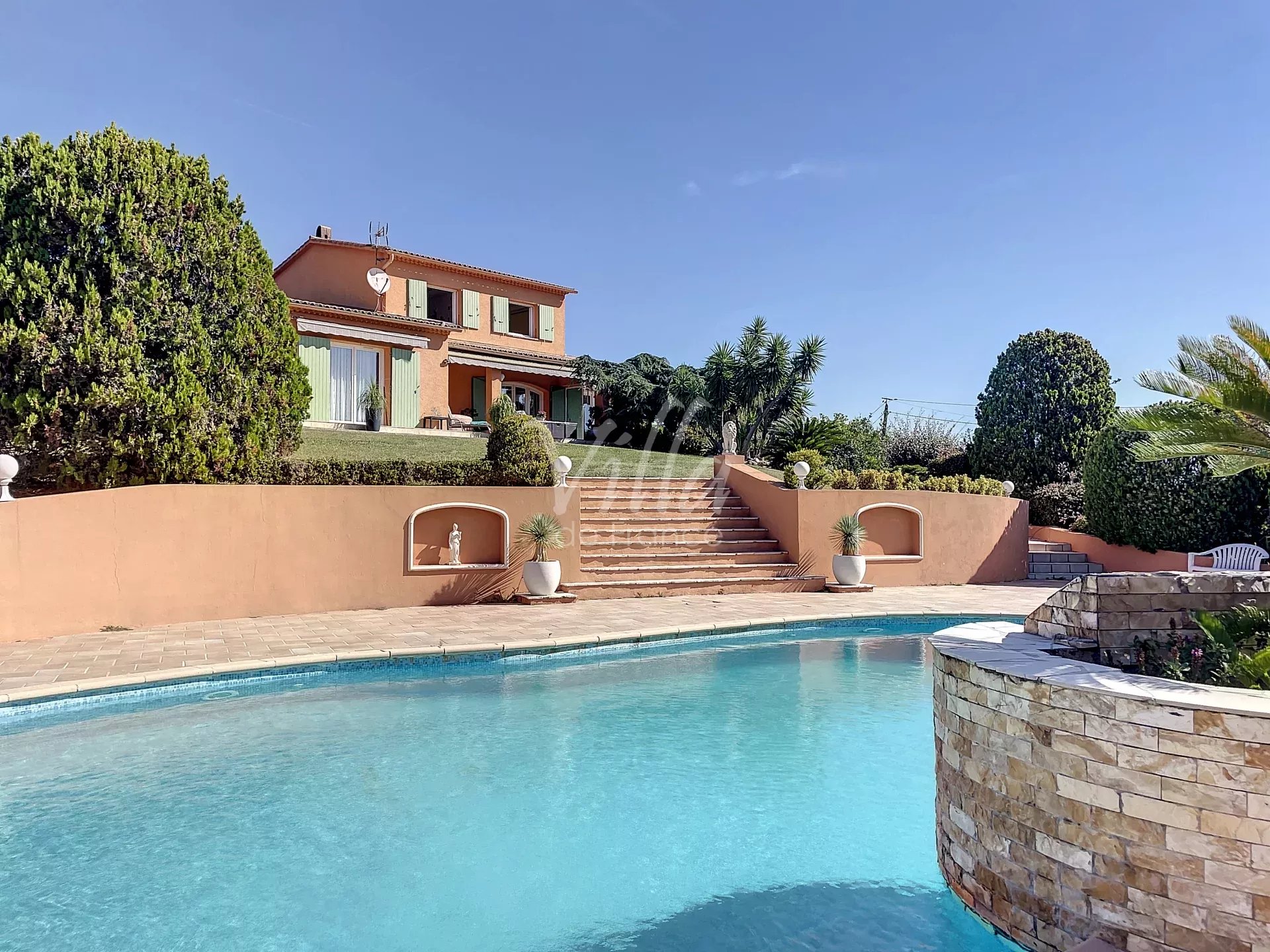 Situata in una tranquilla zona residenziale, vicino al prestigioso campo da golf Barbossi, scoprite questa incantevole villa di circa 200 m² di superficie abitabile, costruita su un ampio terreno pianeggiante e alberato di circa 2.350 m², con piscina e una magnifica vista mare. La villa, esposta a sud e completamente climatizzata, è così composta: