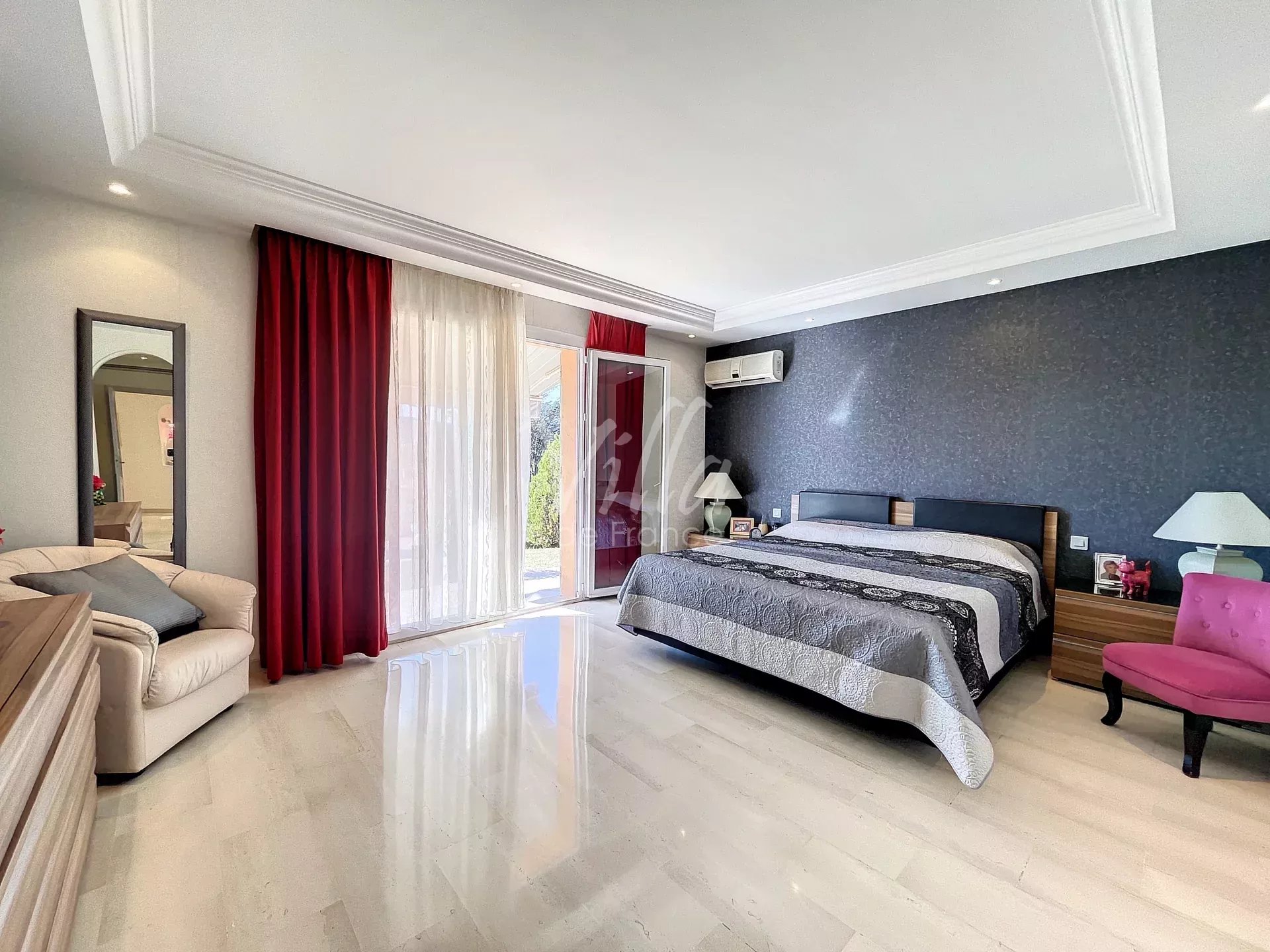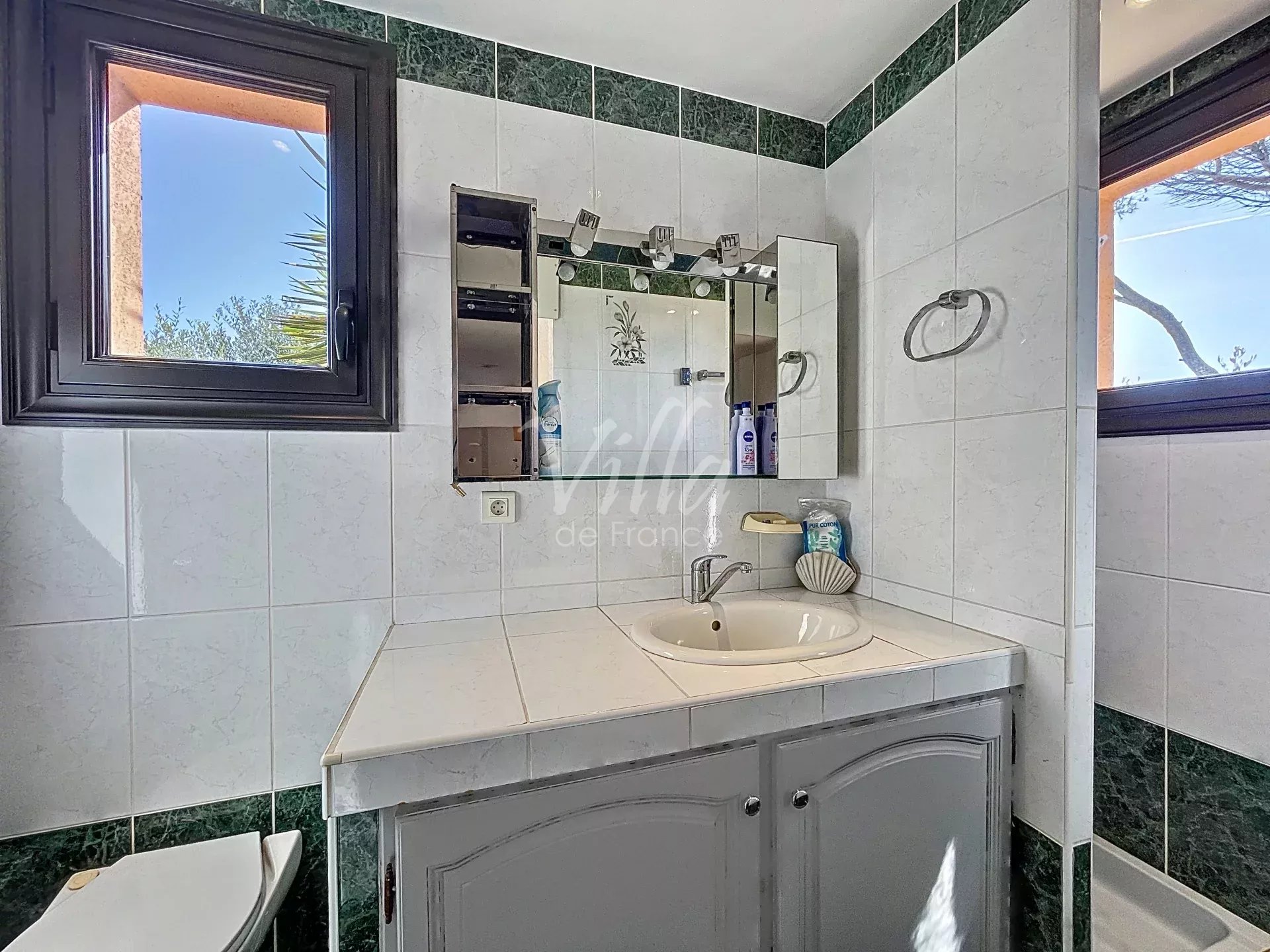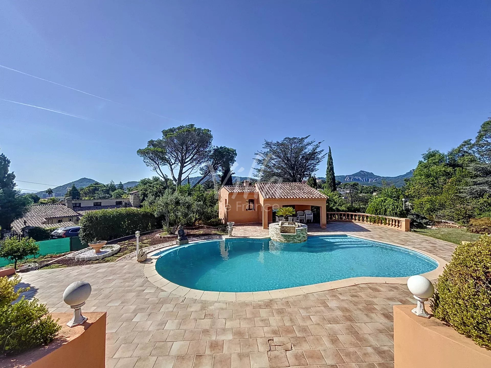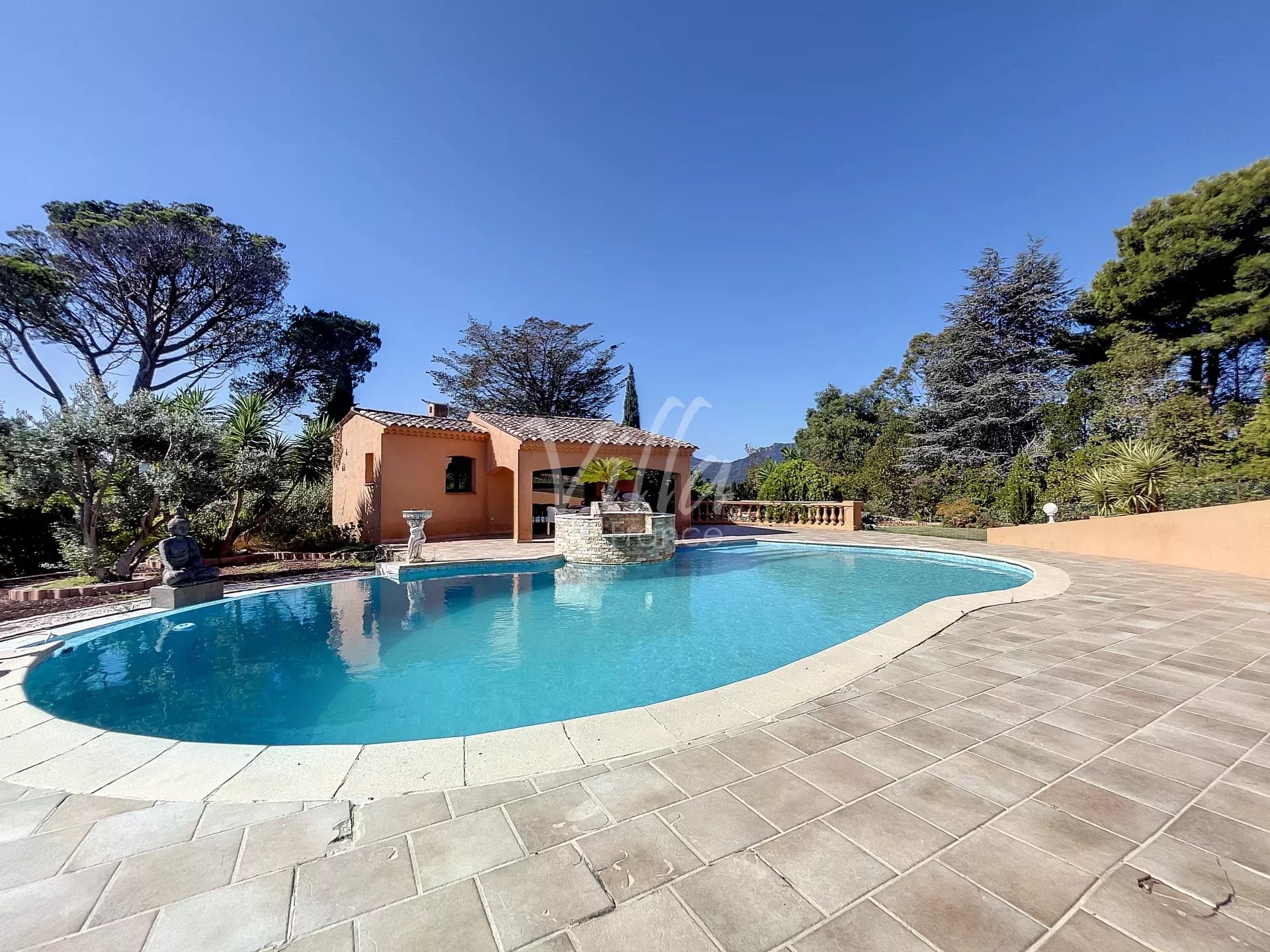 Situata in una tranquilla zona residenziale, vicino al prestigioso campo da golf Barbossi, scoprite questa incantevole villa di circa 200 m² di superficie abitabile, costruita su un ampio terreno pianeggiante e alberato di circa 2.350 m², con piscina e una magnifica vista mare. La villa, esposta a sud e completamente climatizzata, è così composta: